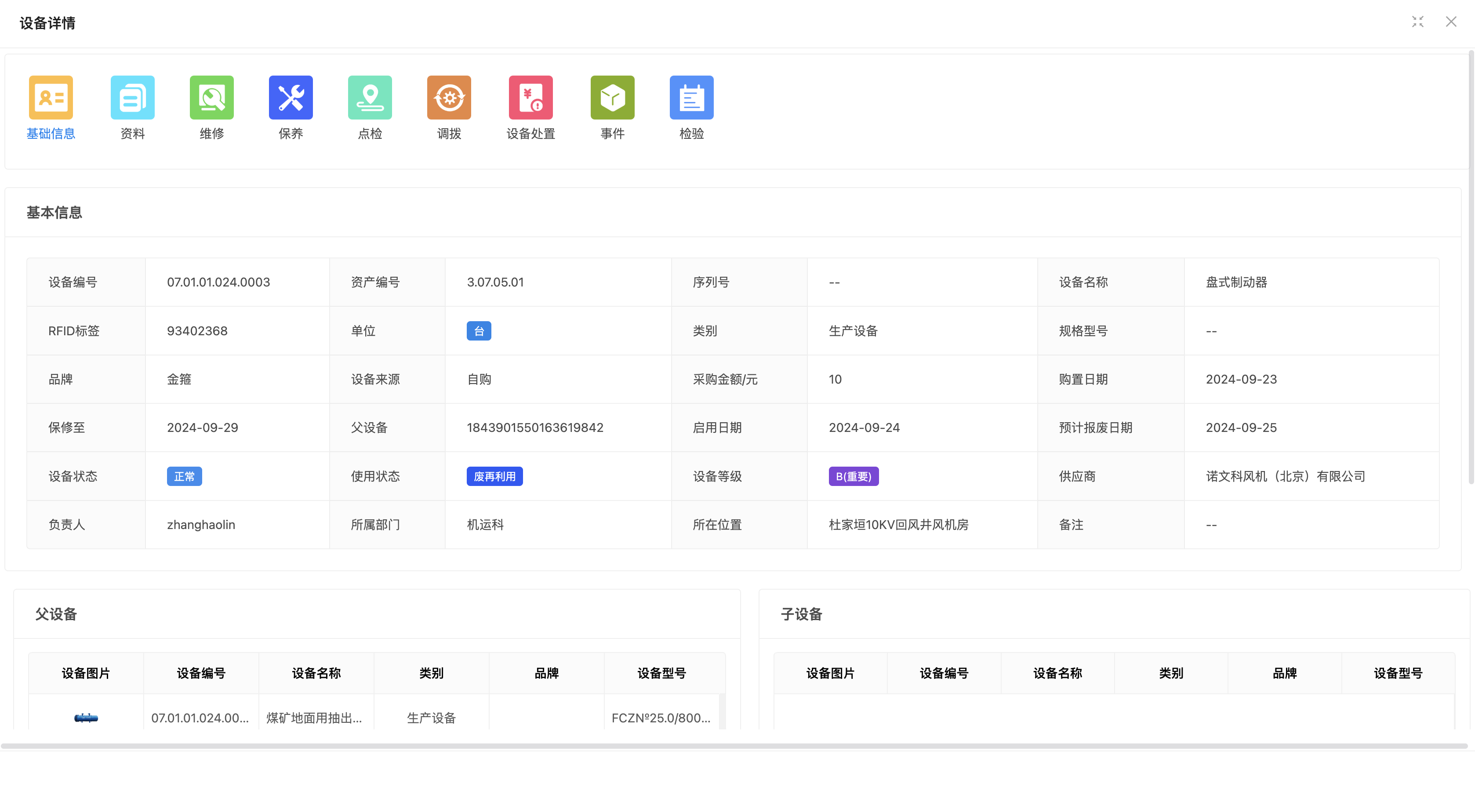 包括台账管理、设备事件、设备处置、设备调拨等,通过完备的设备管理,为设备的维护、保养、维修、报废、处置、调拨等管理活动提供准确的设备信息。