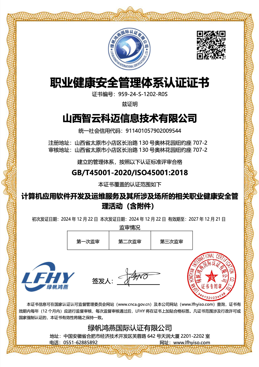 职业健康安全管理体系认证证书